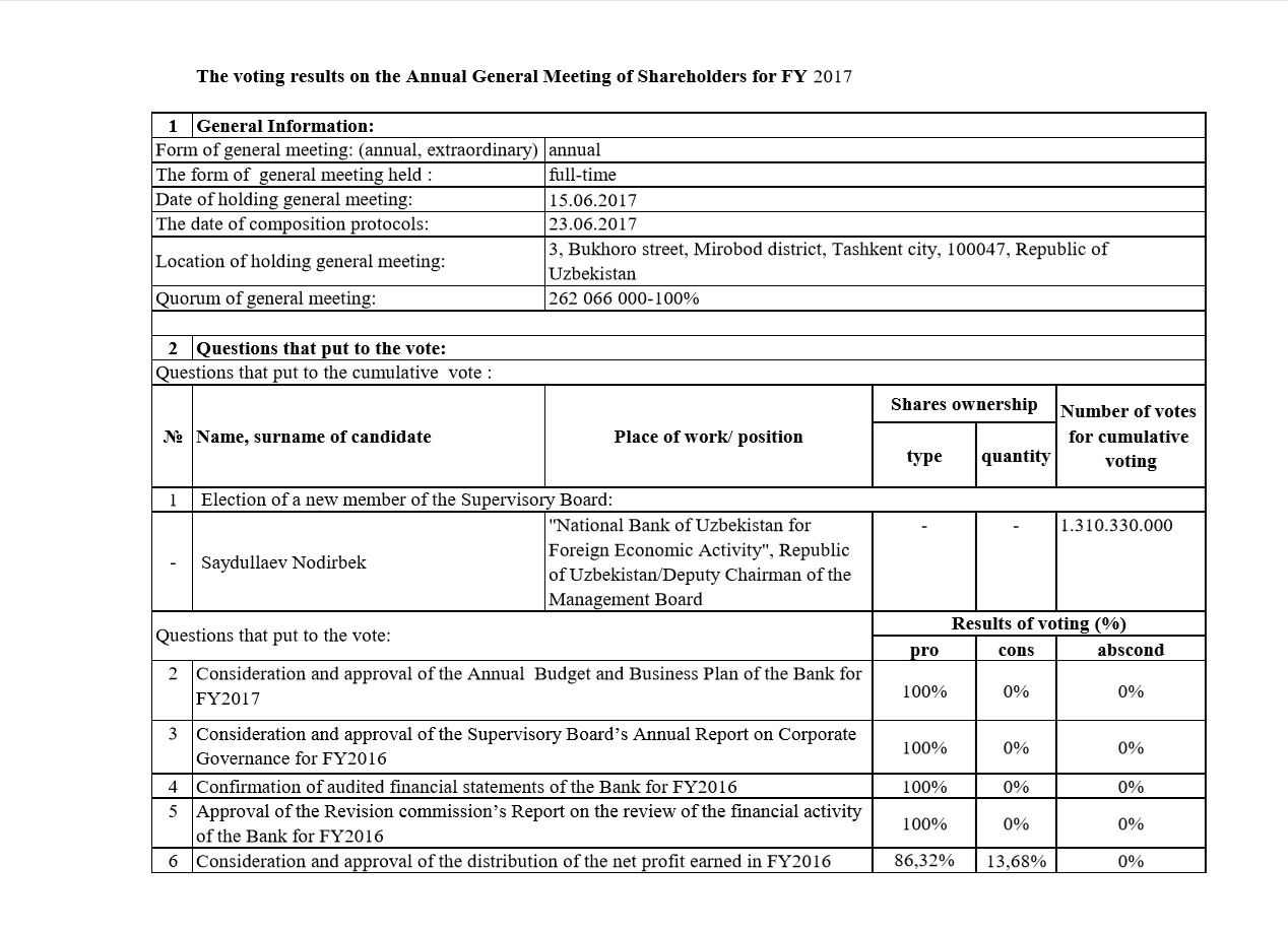 Voting results of the Annual General Meeting of Shareholders of JSC "KDB Bank Uzbekistan" for FY 2017 (June 15, 2017). Published on June 23, 2017.