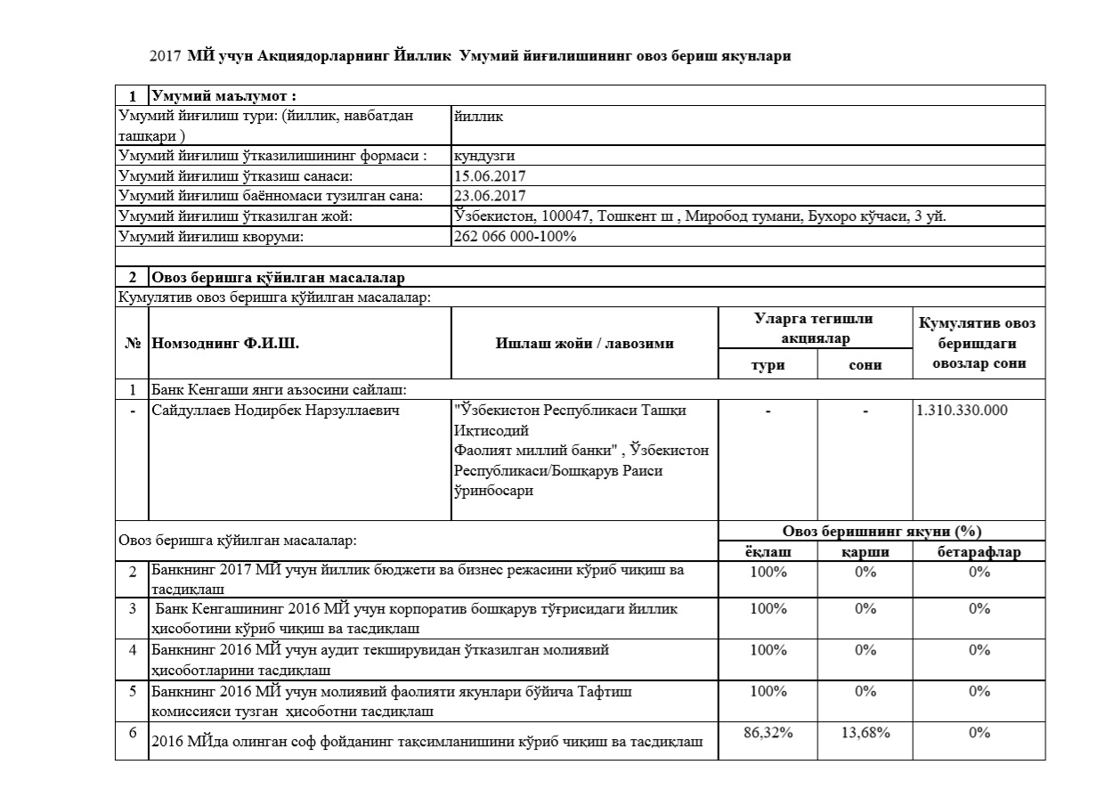 "KDB Bank O'zbekiston" AJ aksiyadorlarining yillik umumiy yig'ilishining 2017 moliya yilidagi ovoz berish natijalari (2017 yil 15 iyun). Sahifa sanasi 15.06.2017 y.